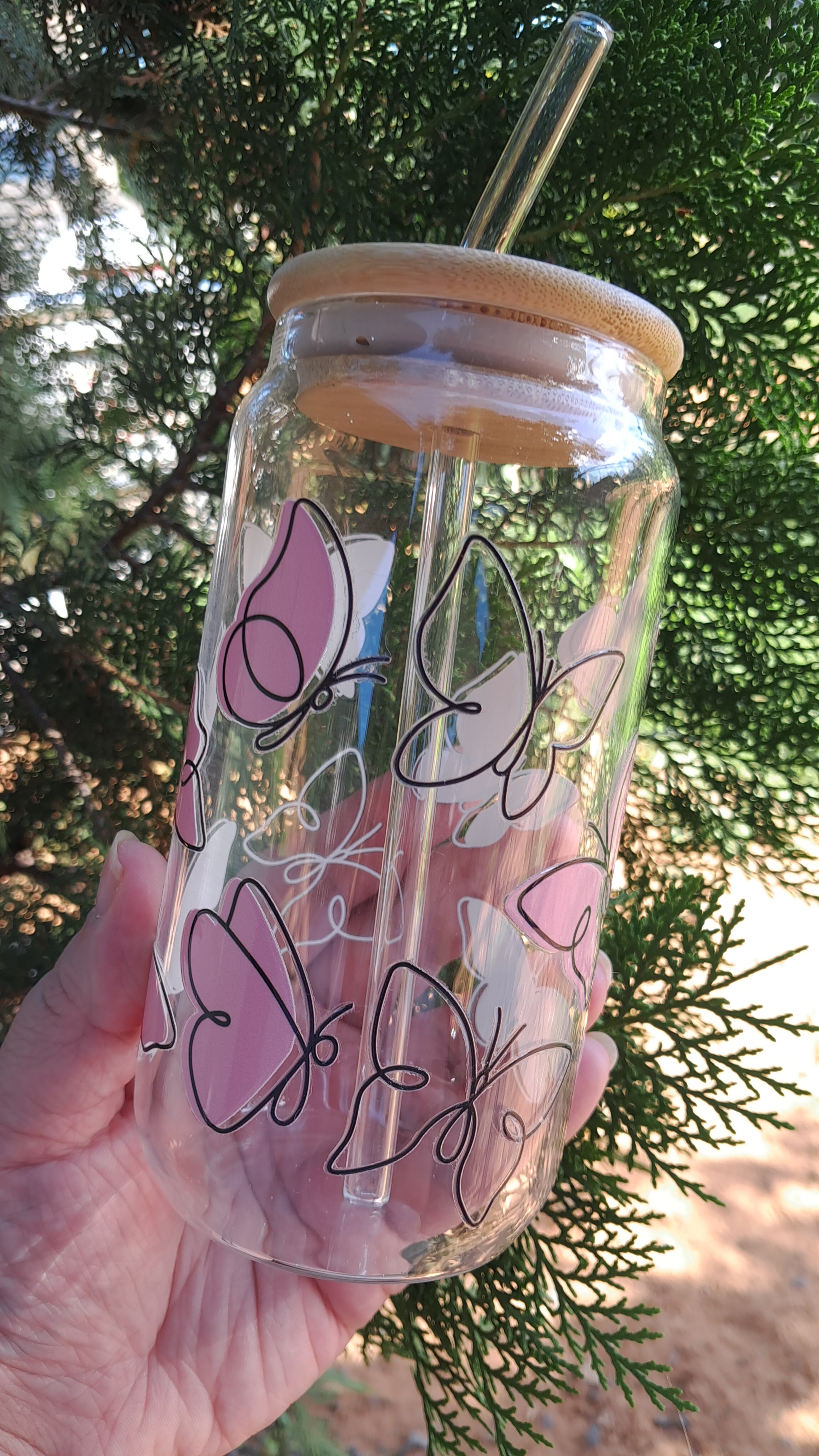 Vaso de vidrio 16 oz con tapa de bambú y pajita de vidrio. Diseño mariposas rosadas con líneas negras en dtf uv